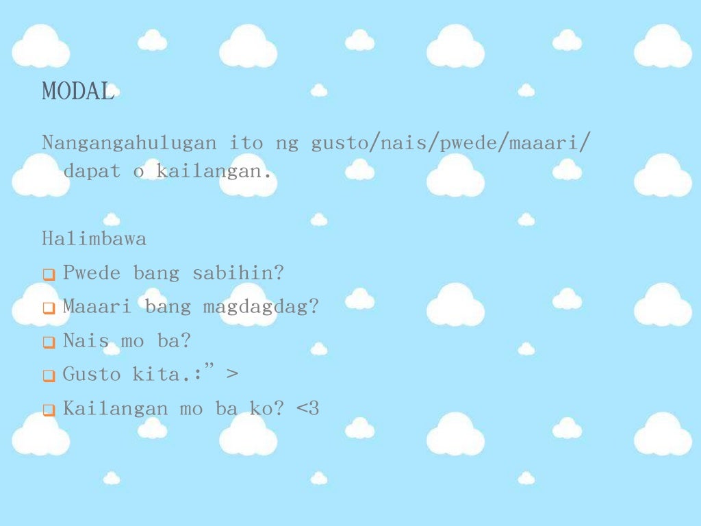 Halimbawa ng pangungusap na modal. -May bgay na umiiral sa himig totoo ng pangungusap sa tulong ng mga katgang may o mayroon. Itoy dahil nagpapahayag ang mga modal ng isang kagustuhan kakayahan pahintulod posibilidad o obligasyon. And modal ay naihahalintulad sa isang pandiwa.